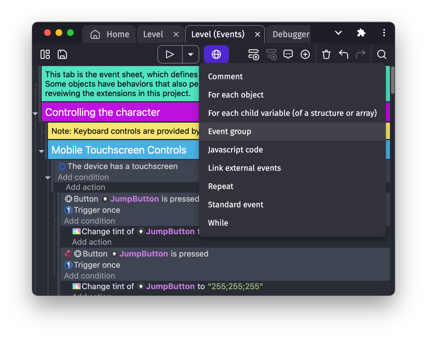 You can add an Event Group by selecting this option in the drop-down menu shown when you click the + button in the Events Sheet toolbar: