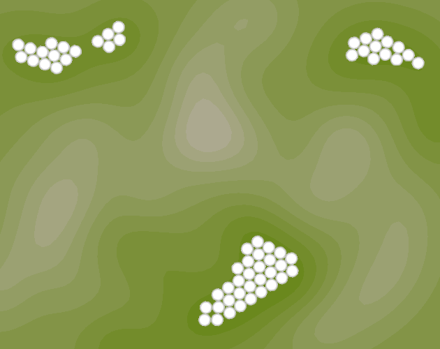 Previous sections show how to build shapes using "disk" actions that work a bit like a brush from drawing applications. In these applications, paint bucket tools can fill an area with color. In the same way, parts of the field can be filled to a given level with the "flood" action. It can also be seen as flooding a valley for a dam.