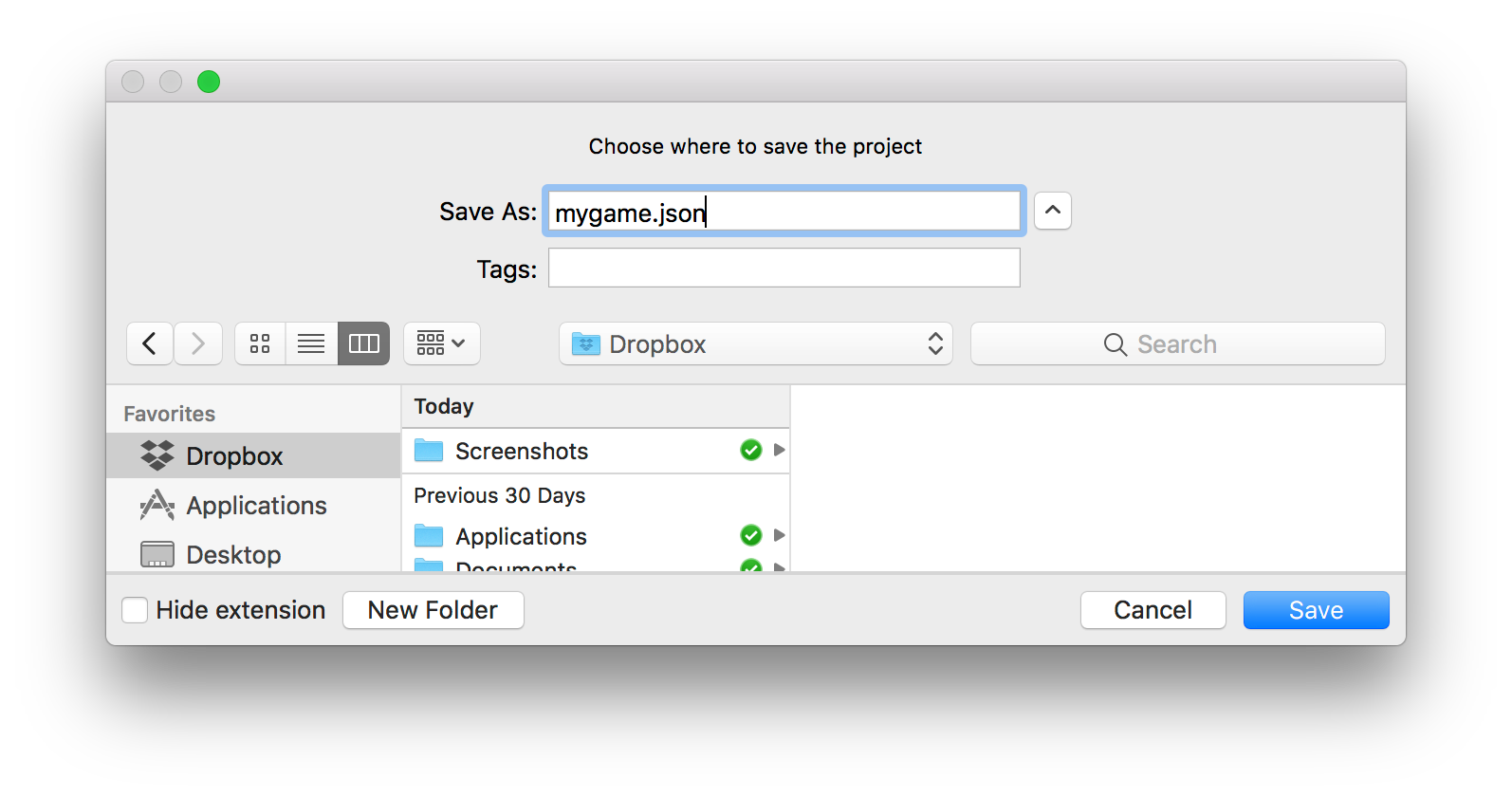 - Choose a folder, then enter a filename finishing by .json. For example: