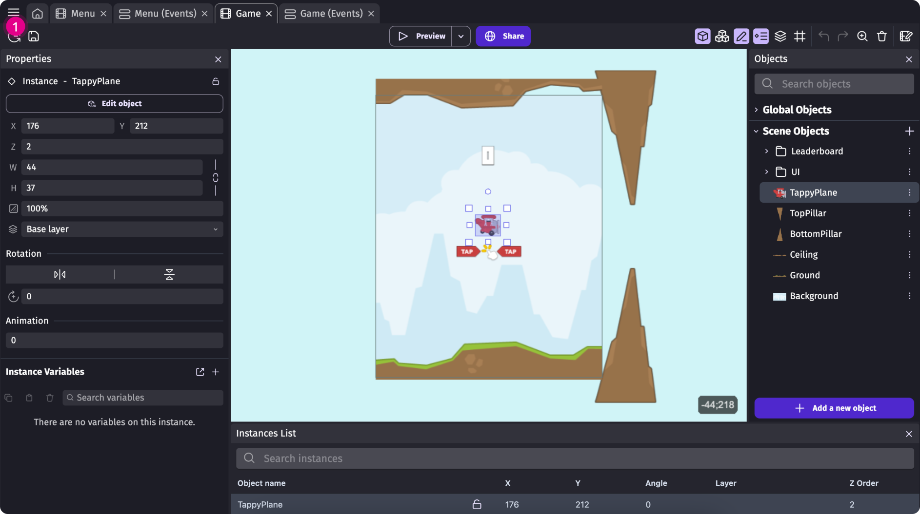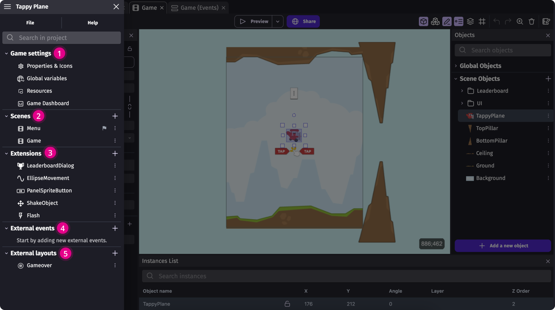 2. Scenes: Scenes are the different screens and levels in your game. Everything in GDevelop is created in scenes.