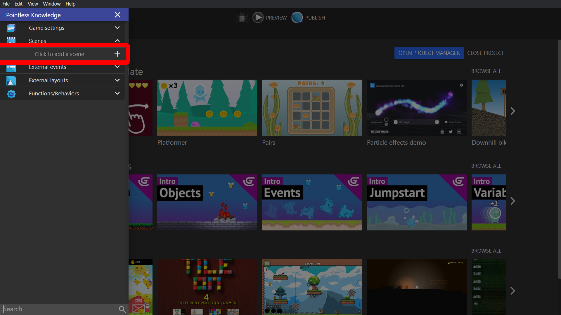 Add a scene by pressing on the highlighted button in the image below. Right click on that scene to rename it. Then left click on the scene to open it.