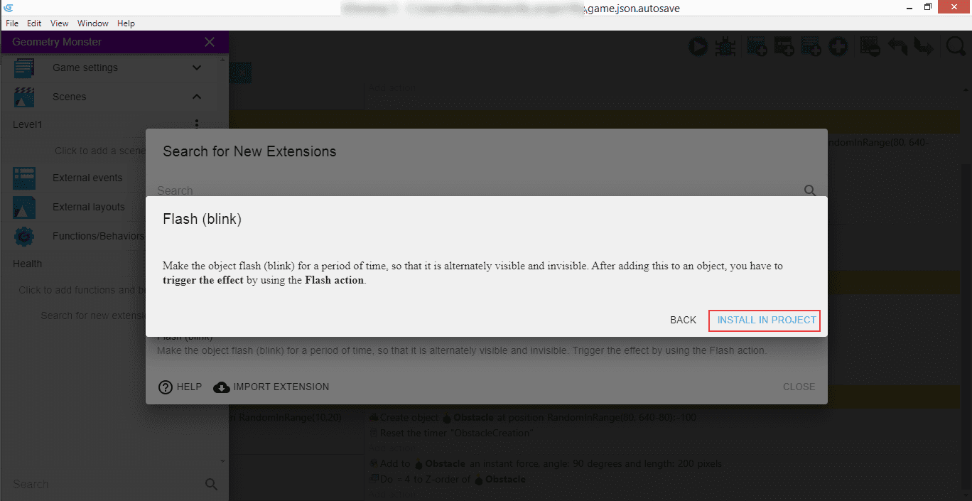 This introduces a behavior called "Health", which we can then manipulate in our game to manage the life of an object. Click "Install in project" to be able to use it.