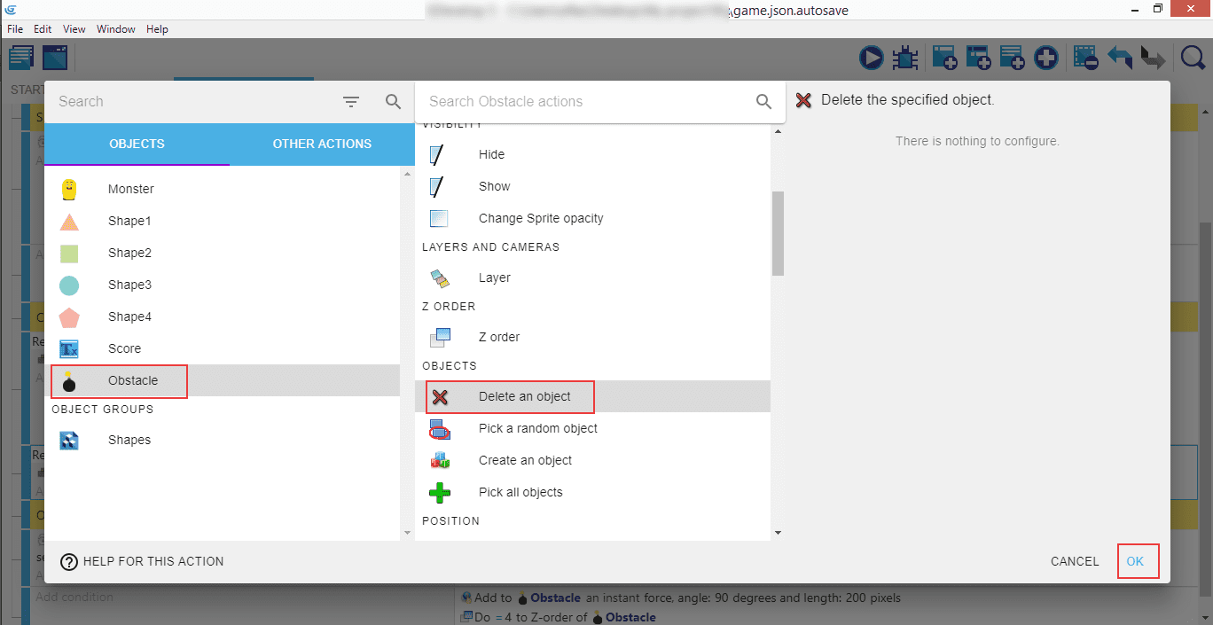 The action "Delete an object" will remove the "Obstacle". Whenever a bomb hits the Monster, it will be deleted from the game.