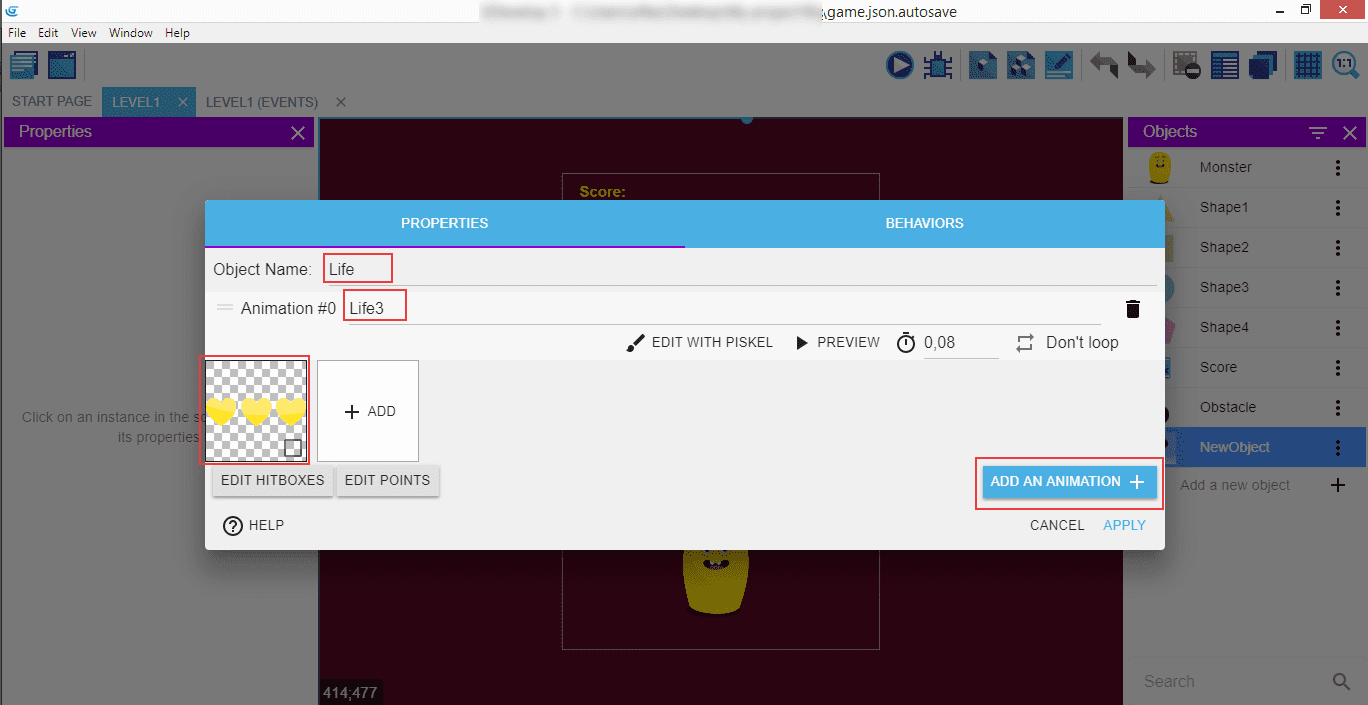 Object's name is "Life", "Animation" is "Life3" (since the initial state of the animation have three lives), and then add the image of the hearts.