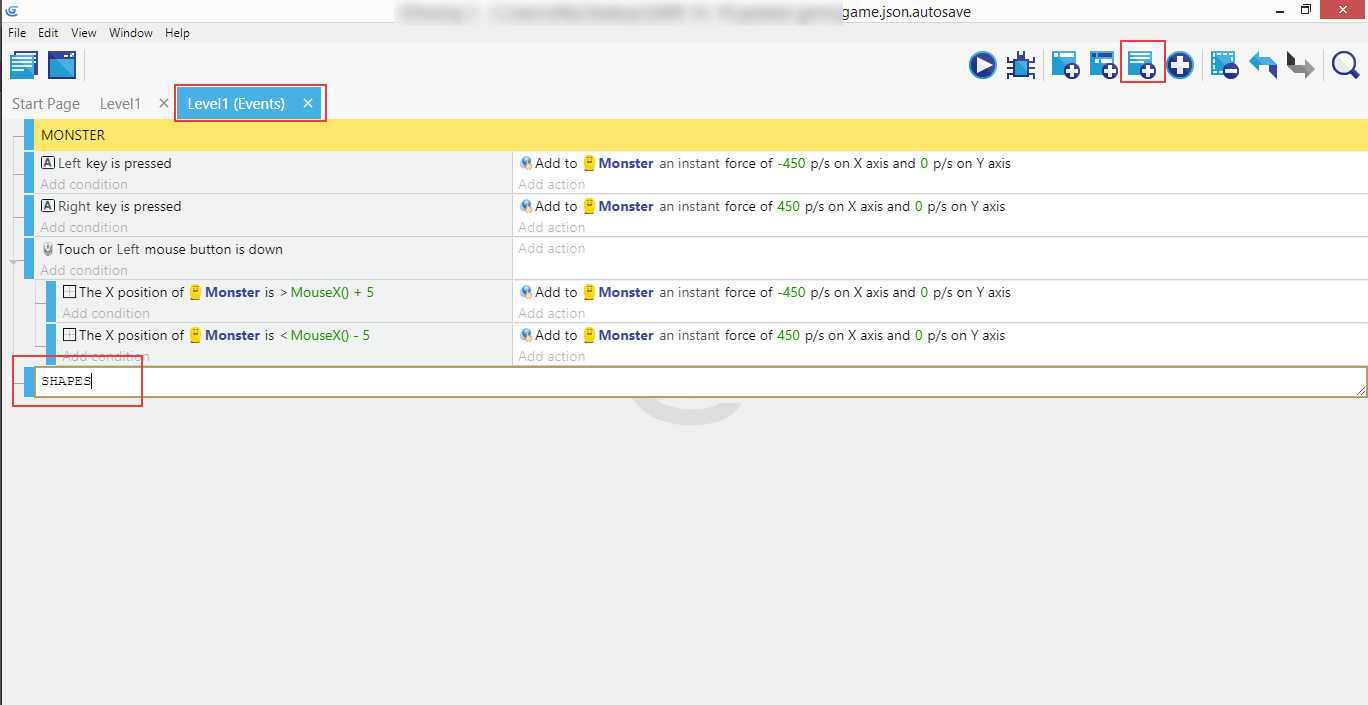Next create a new event above the shapes event and give it the condition "at beginning of the scene", and copy/paste the earlier create "Start (or reset) a scene timer" action for "ShapeCreation" to this new event. This will start the timer at the beginning of the game in so the shapes event will trigger the first time.