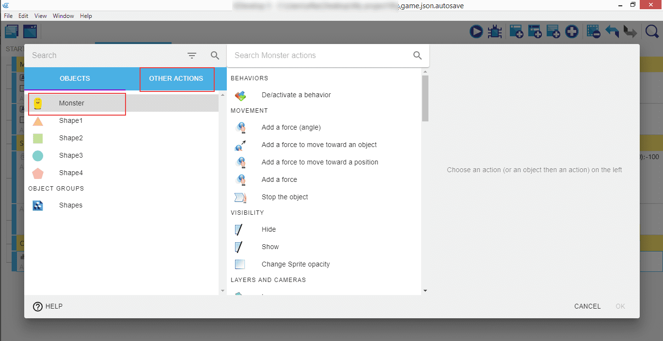 It will open a popup where you'll be able to choose and load an audio file that will be played when the shape will be collected by the Monster. For us, it's called monster.wav.