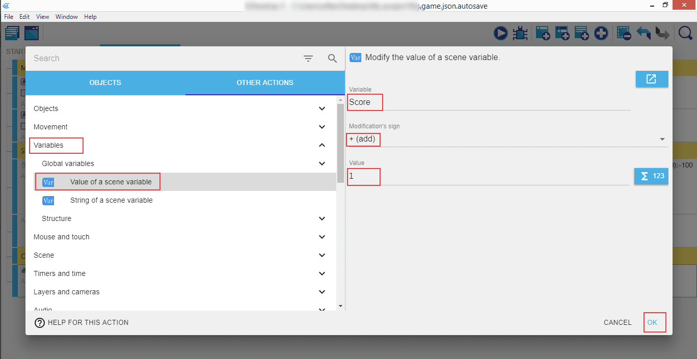 Go to the "Level1 (Events)" tab, click "Add an action", and in the popup select our new "Score" variable, look for "Modify the text", and in the right panel select "Modification's sign" to = (set to), with the text "Score: " + ToString(Variable(Score)).