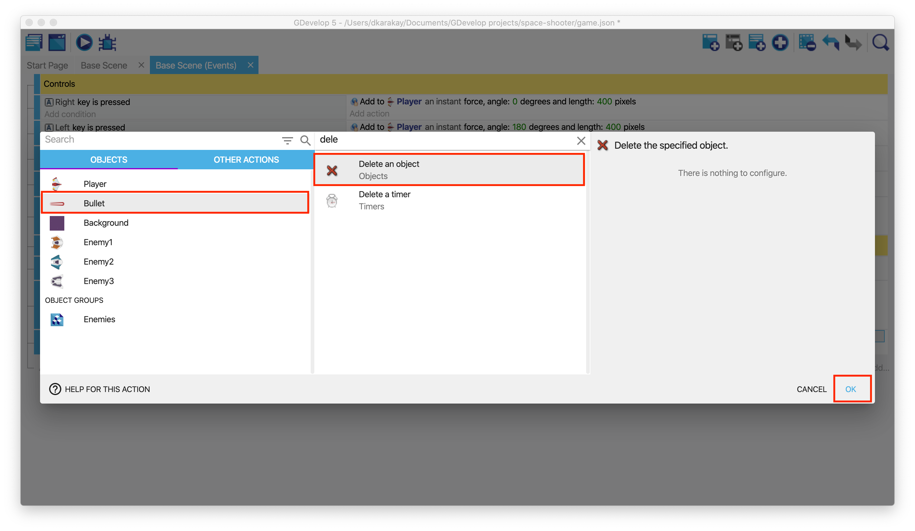 If the collision happens between bullets and enemies, we need to remove the Bullet objects. Hence, we will add a new action next to the previous condition. Pick Bullet object and select Delete an object.