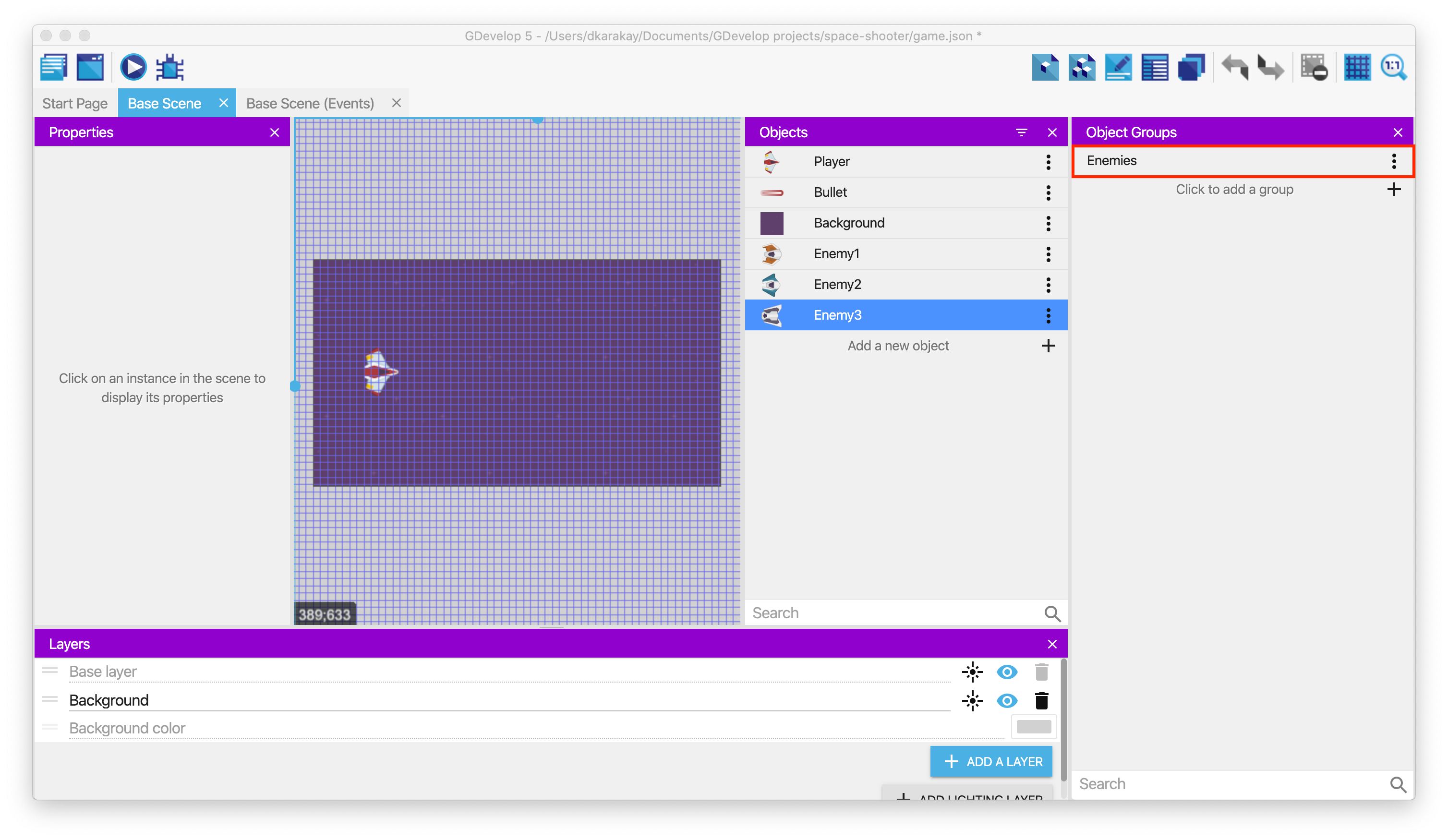 We'll now create an object group called "Enemies". This will be useful in events, to refer to all the objects in the group without repeating events for each object.