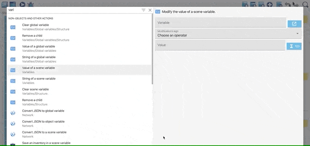 Now, create an action and type "variable" on the search bar. Then, select Value of a scene variable and click on the button next to the action details. In this window, create a scene variable called "IsDamaged" and give its initial value 0. Then click apply.
